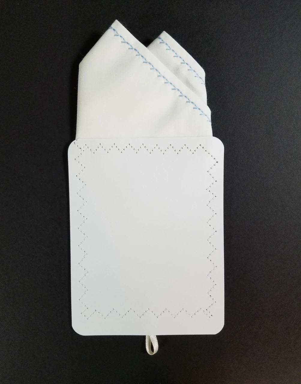 Dress up your suit or sport coat with a pre-folded pocket square. It’s easy to use and looks like a well placed pocket square. Just slip the insert into your breast pocket and adjust height to your taste. Trim bottom of card if you want less pocket square showing.