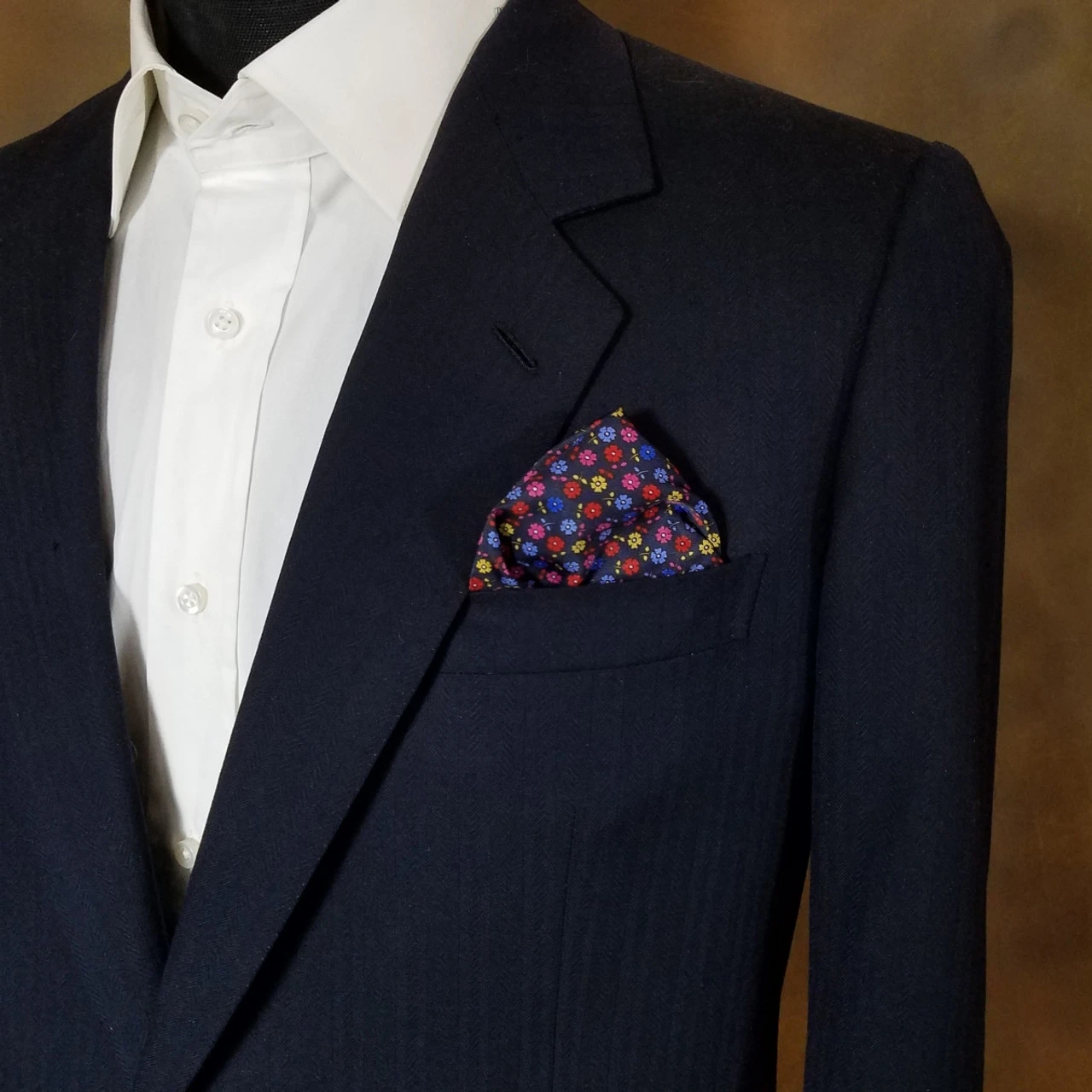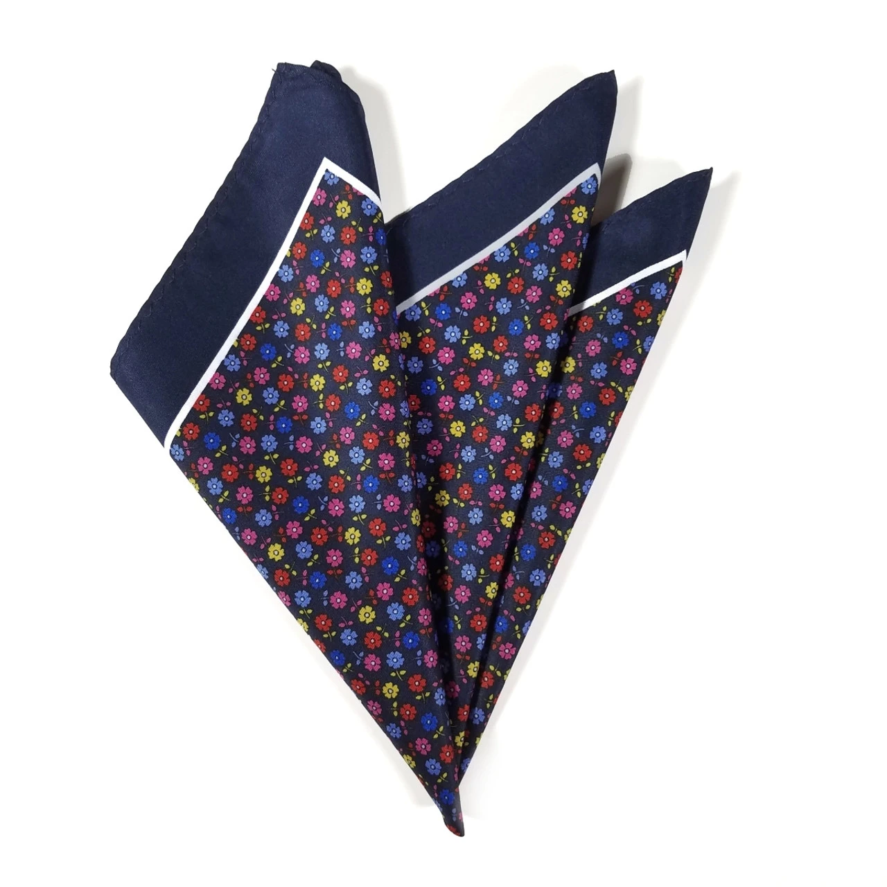 100% Silk Pocket Square – Navy Blue With Petite Multi-Colored Flowers 12.5in