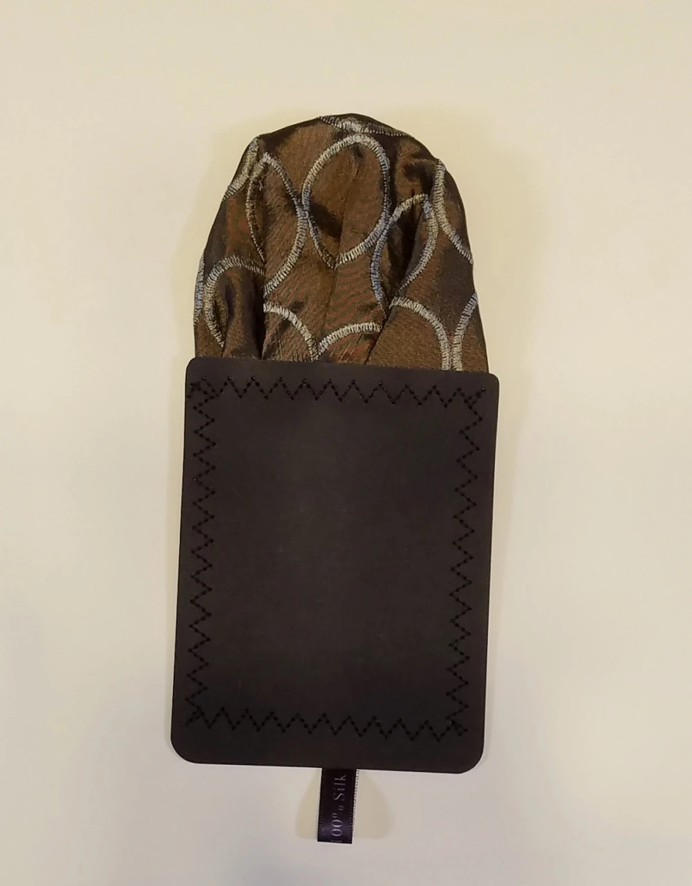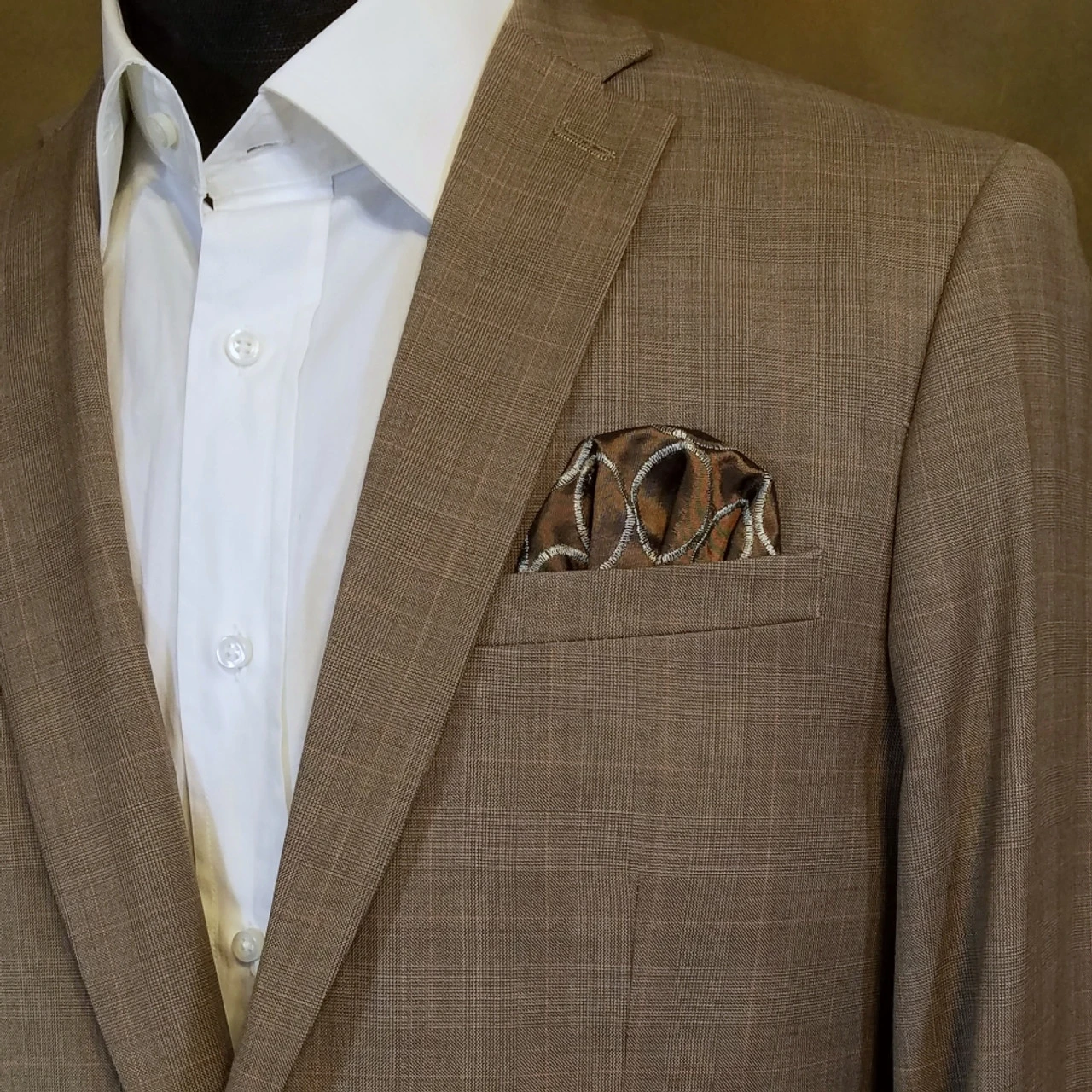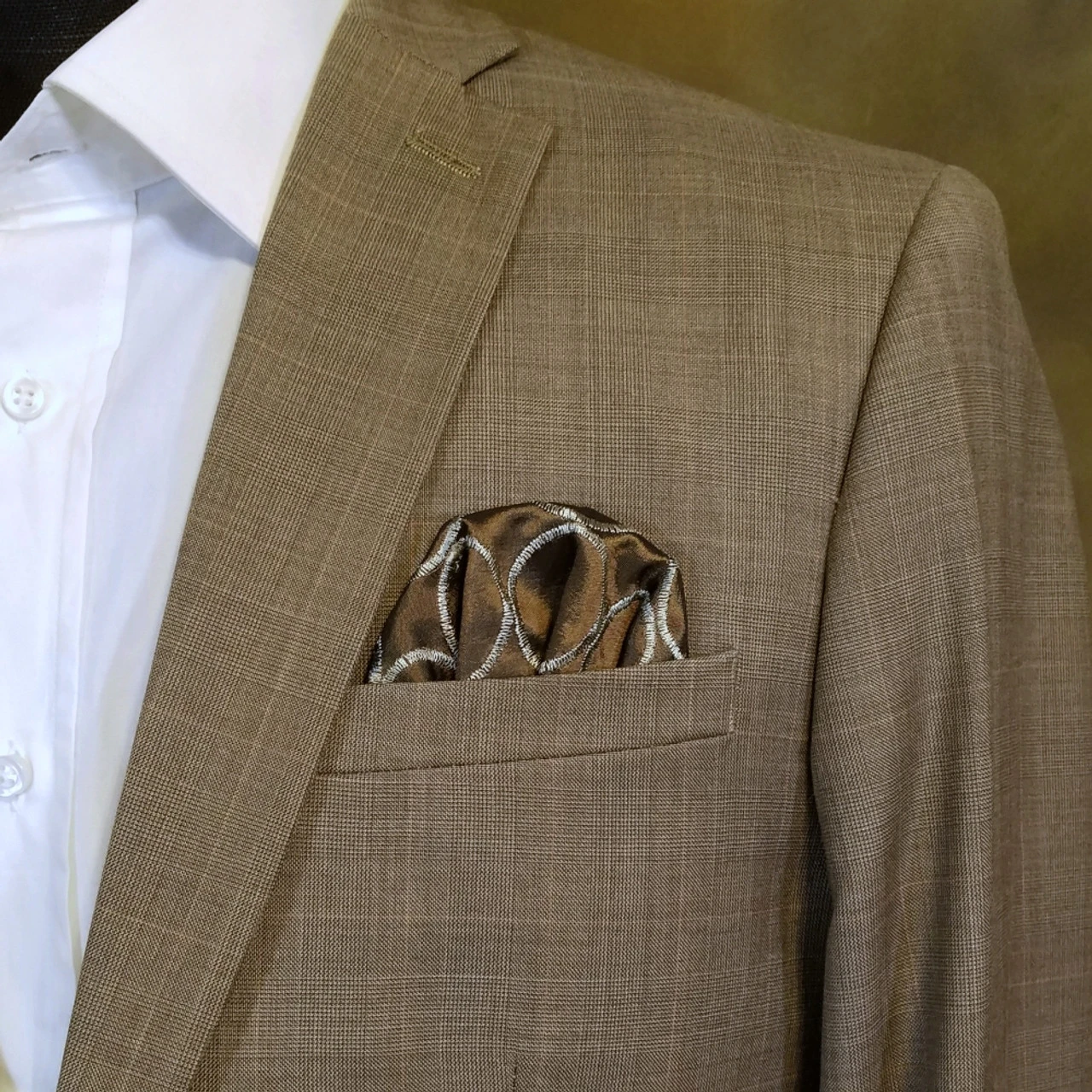 Dress up your suit, blazer or sport coat with this bronze 100% silk dupioni pre-folded pocket square. It is a rich bronze tone with metallic light tan circles embroidered on it. It’s easy to use and looks like a well place pocket square. Just slip the insert into your breast pocket. Cut or fold bottom of insert card to shorten if necessary.Â