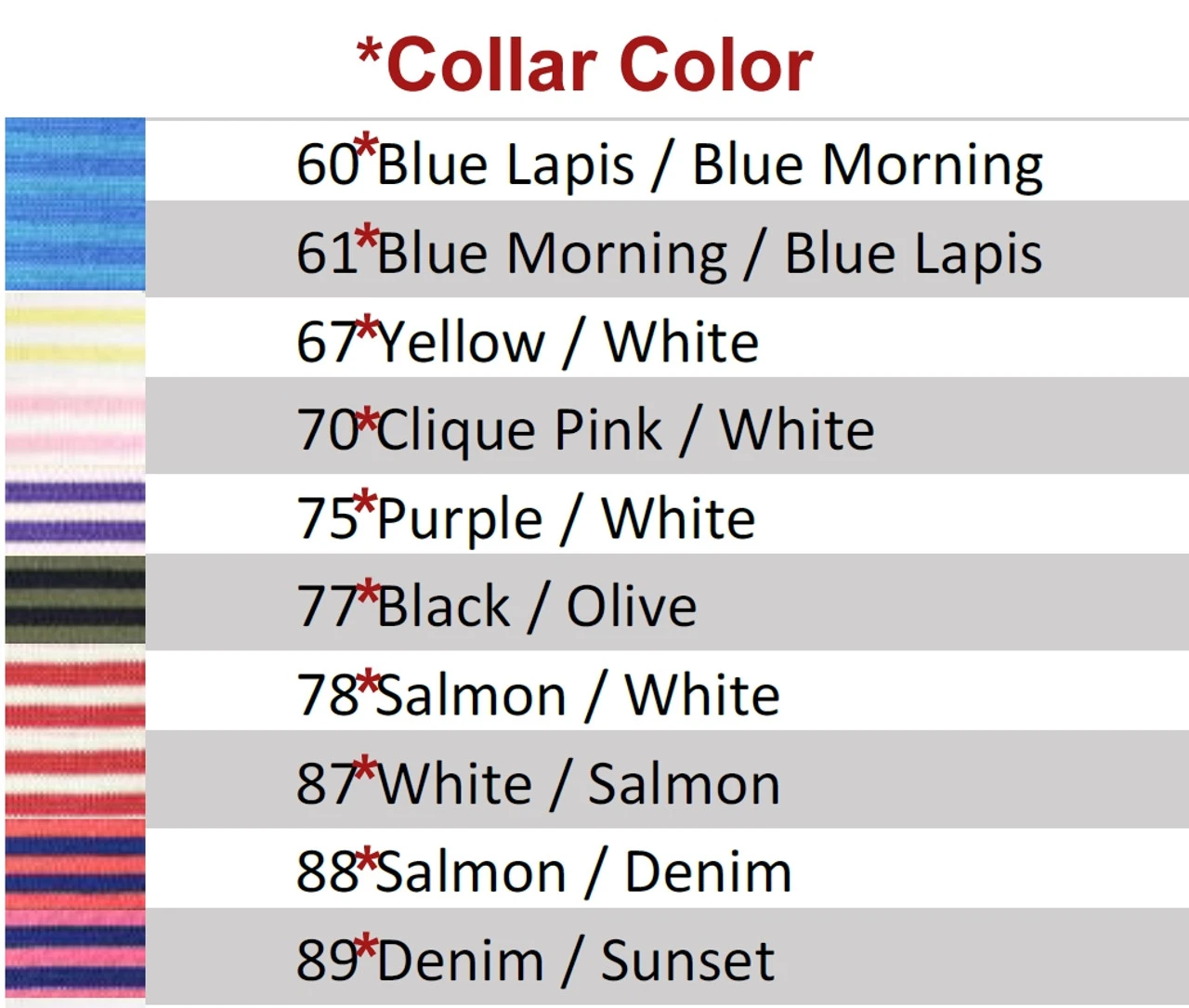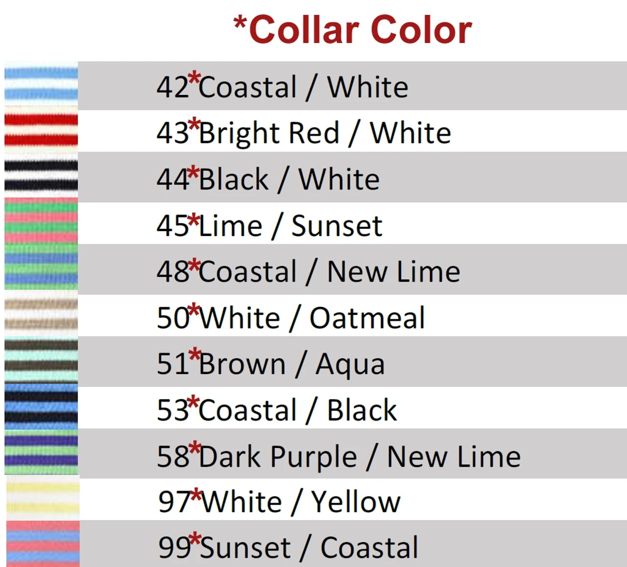 | Color Required | Black/Dk. Oatmeal – Black Collar, Black/Olive – Black Collar, Black/White – Black Collar, Blue Lapis/Lt. Blue – Blue Lapis Collar, Bright Red/White – Red Collar, Brown/Aqua – Brown Collar, Coastal Blue/Black – Coastal Blue Collar, Coastal Blue/Lime – Coastal Blue Collar, Coastal Blue/Sunset – Coastal Blue Collar, Coastal Blue/White – Coastal Blue Collar, Denim Blue/White – Denim Collar, Dk. Purple/Lime – Dk. Purple Collar, Forest Green/Navy – Forest Collar, Kelly Green/Lime – Kelly Green Collar, Lime/Sunset – Lime Collar, Lime/White – Lime Collar, Navy/Burgundy – Navy Collar, Navy/Forest Green – Navy Collar, Navy/Raspberry – Navy Collar, Navy/White – Navy Collar, Navy/Yellow – Navy Collar, Oatmeal/White – Oatmeal Collar, Pink/White – Pink Collar, Purple/White – Purple Collar, Raspberry/Lt. Green – Raspberry Collar, Salmon/Denim Blue – Salmon Collar, Salmon/White – Salmon Collar, Sky Blue/Pink – Sky Blue Collar, White/Coastal Blue – White Collar, White Lime – White Collar, White/Oatmeal – White Collar, White/Yellow – White Collar |