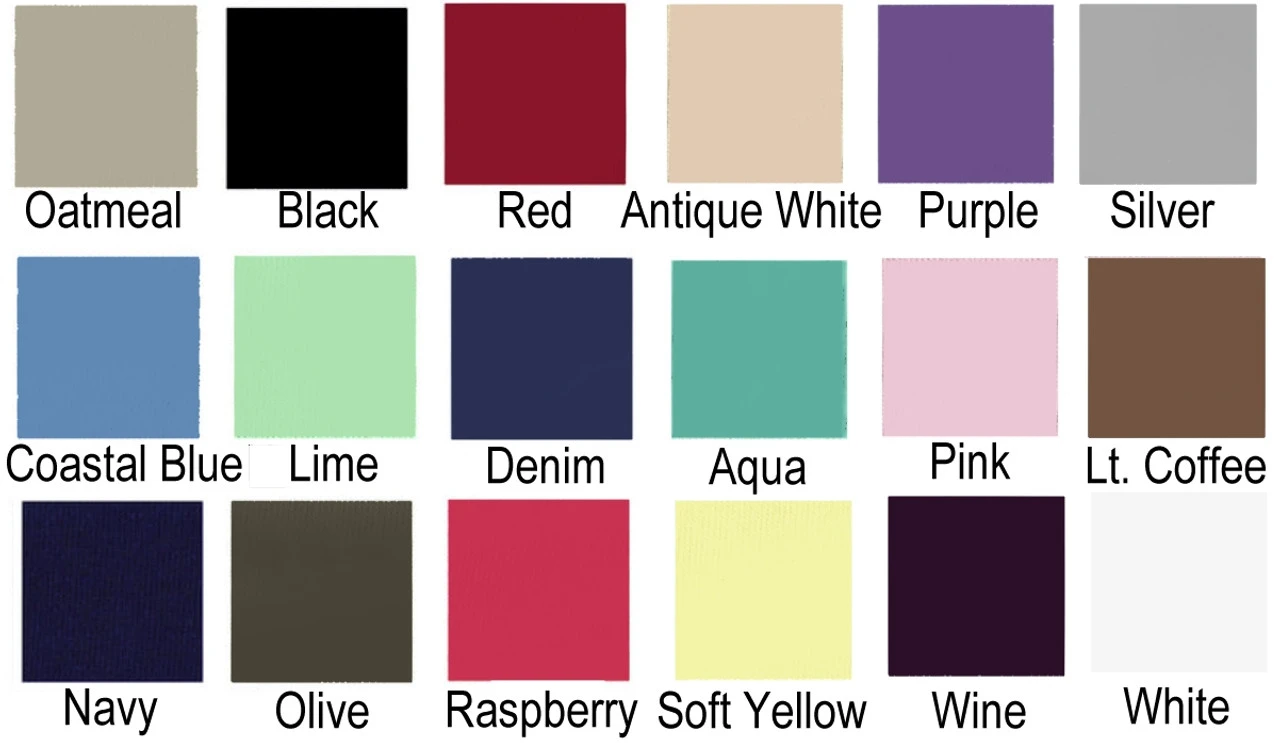 | Color Required | Antique White, Aqua, Black, Coastal Blue, Denim Blue, Lt. Coffee, Navy, New Lime, Oatmeal, Olive, Pink, Purple, Raspberry, Red, Silver, Soft Yellow, Wine, White |