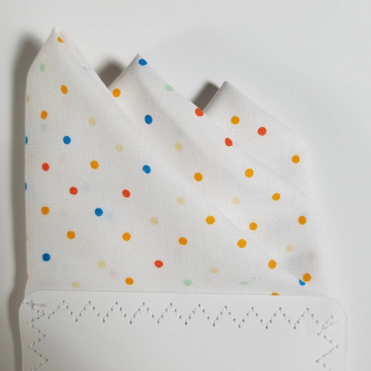 Dress up your suit or sport coat with a pre-folded pocket square. It’s easy to use and looks like a well placed pocket square. Just slip the insert into your breast pocket and adjust height to your taste. Trim bottom of card if you want less pocket square showing.